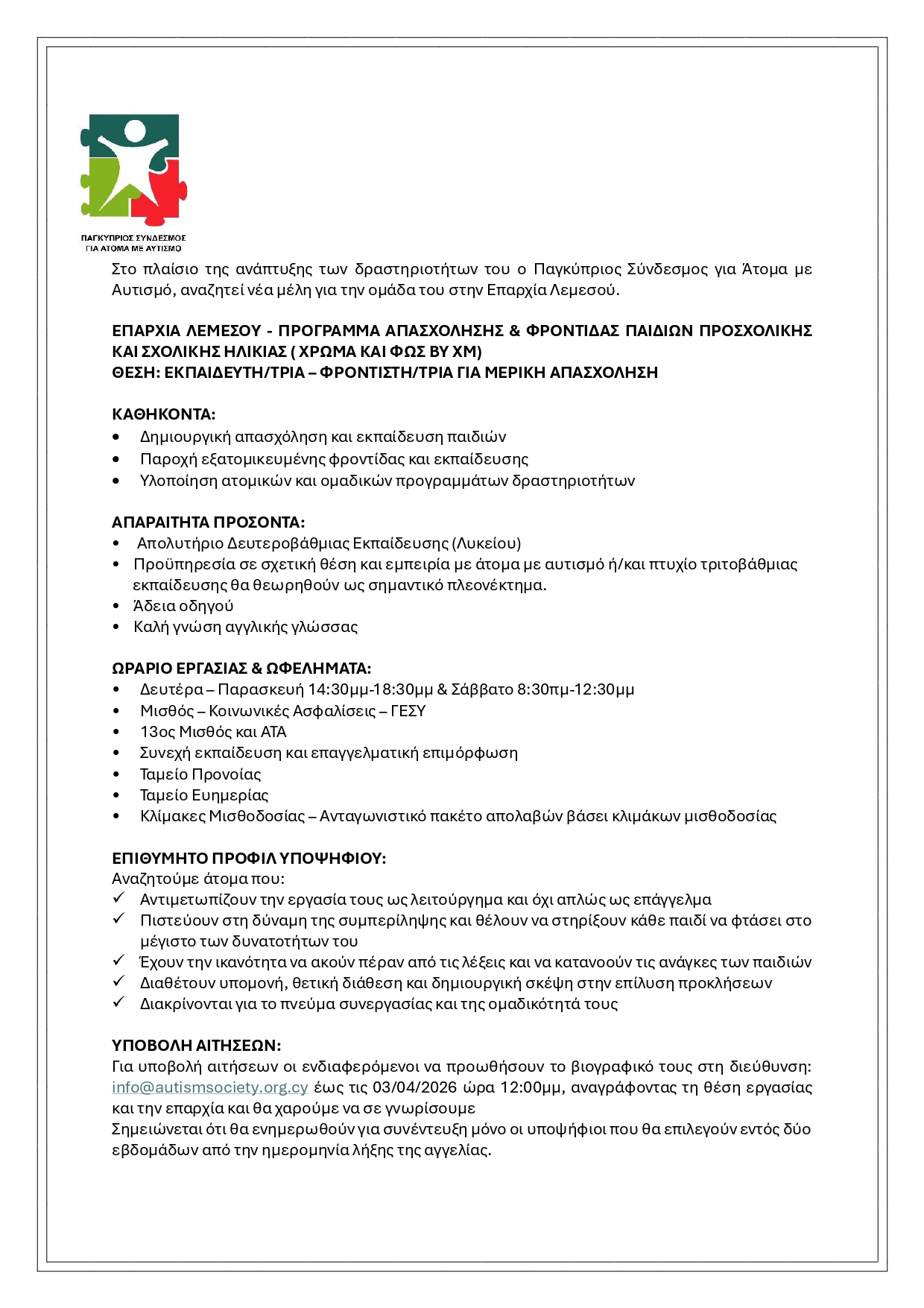 Τύπος Απασχόλησης: Μερική Απασχόληση